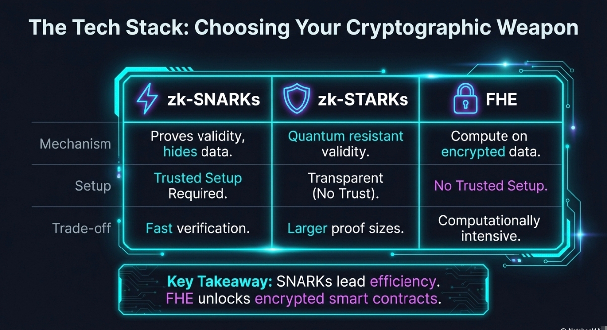 Privacy-preserving DeFi protocols utilize advanced cryptographic techniques to protect user data while maintaining blockchain verifiability. The three primary technological approaches each solve the privacy problem differently.