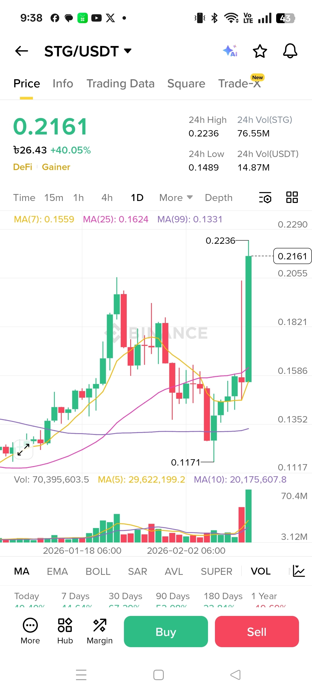 $STG on Binance is printing a textbook bullish daily breakout, and the move is strong enough to put it in the same “momentum shock” category as ZRO. Price launched from the 24h low near 0.14889 and pushed up to around 0.2161 (with a 24h high near 0.2236), clocking roughly +40% in a single day. What makes this breakout harder to ignore is the participation behind it: about 76.55M STG traded in 24 hours, which is massively above the recent volume baselines (your MA(5) and MA(10) volume averages). That kind of volume expansion is usually what separates a “real breakout” from a quick wick-and-fade.