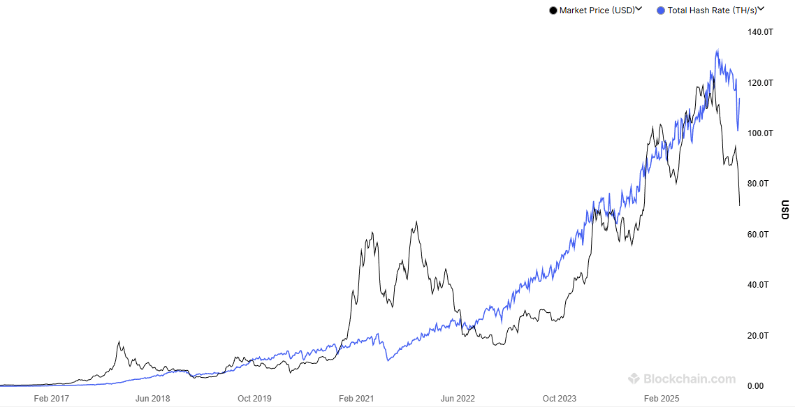 - Trong ngắn hạn, giá thường giảm trước, sau đó Hashrate mới giảm theo (do thợ đào cần thời gian để đánh giá lỗ/lãi trước khi tắt máy).