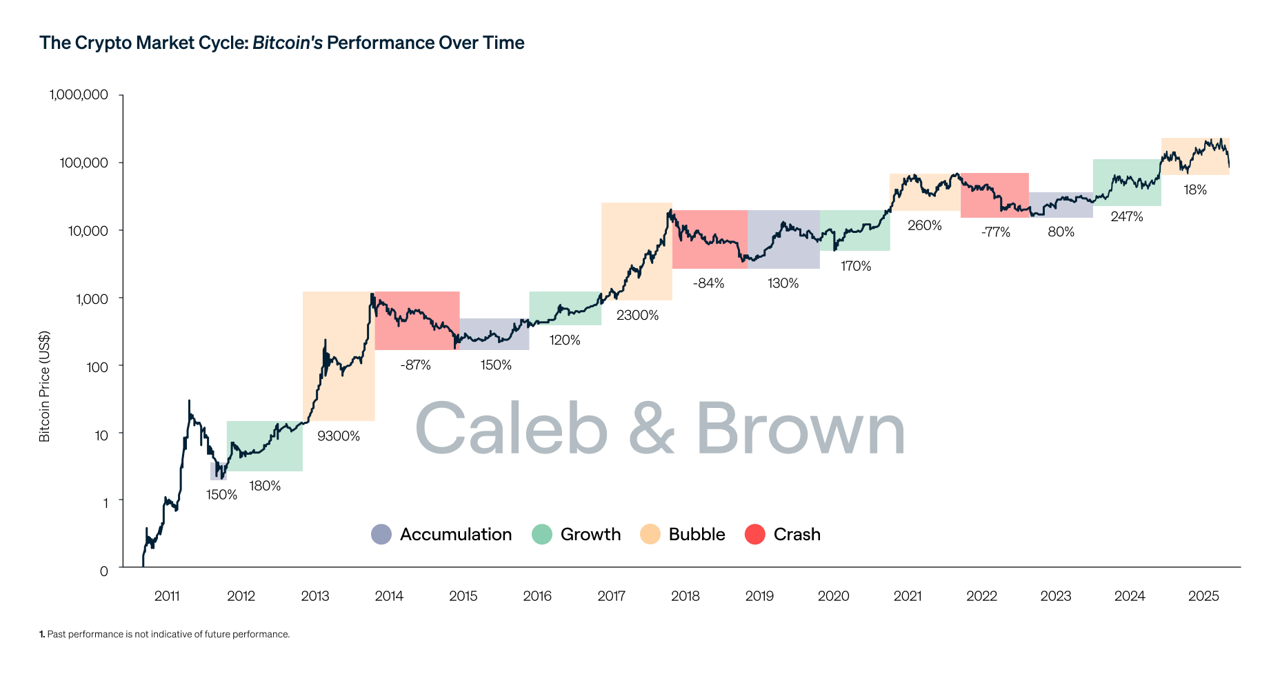 This long-term cycle chart illustrates Bitcoin's historical performance through accumulation, growth, bubble, and crash phases, showing repeated patterns of sharp corrections followed by recoveries.