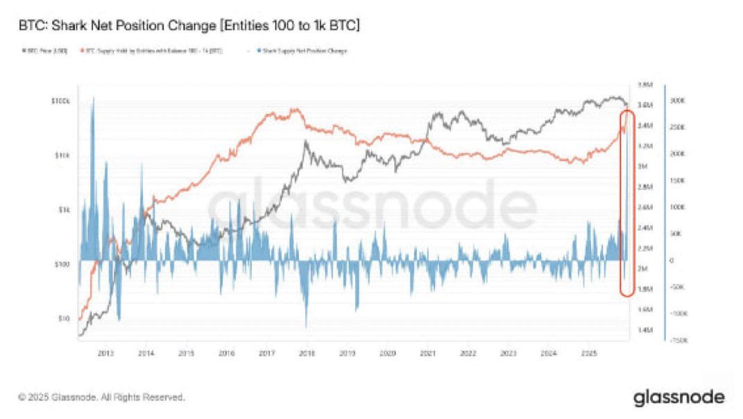 This chart highlights shark net position changes, showing recent upward accumulation spikes.