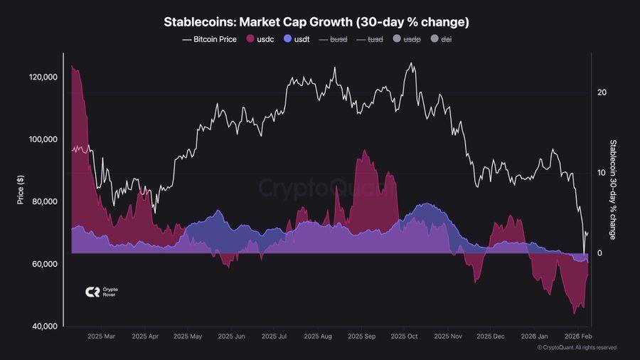 تُظهر بيانات نمو القيمة السوقية للعملات المستقرة خلال 30 يومًا تحولًا ملحوظًا في اتجاه السيولة داخل سوق الكريبتو، حيث سجل كلٌّ من USDT و USDC قراءات سلبية، ما يعكس حالة تريّث واضحة من جانب رؤوس الأموال.