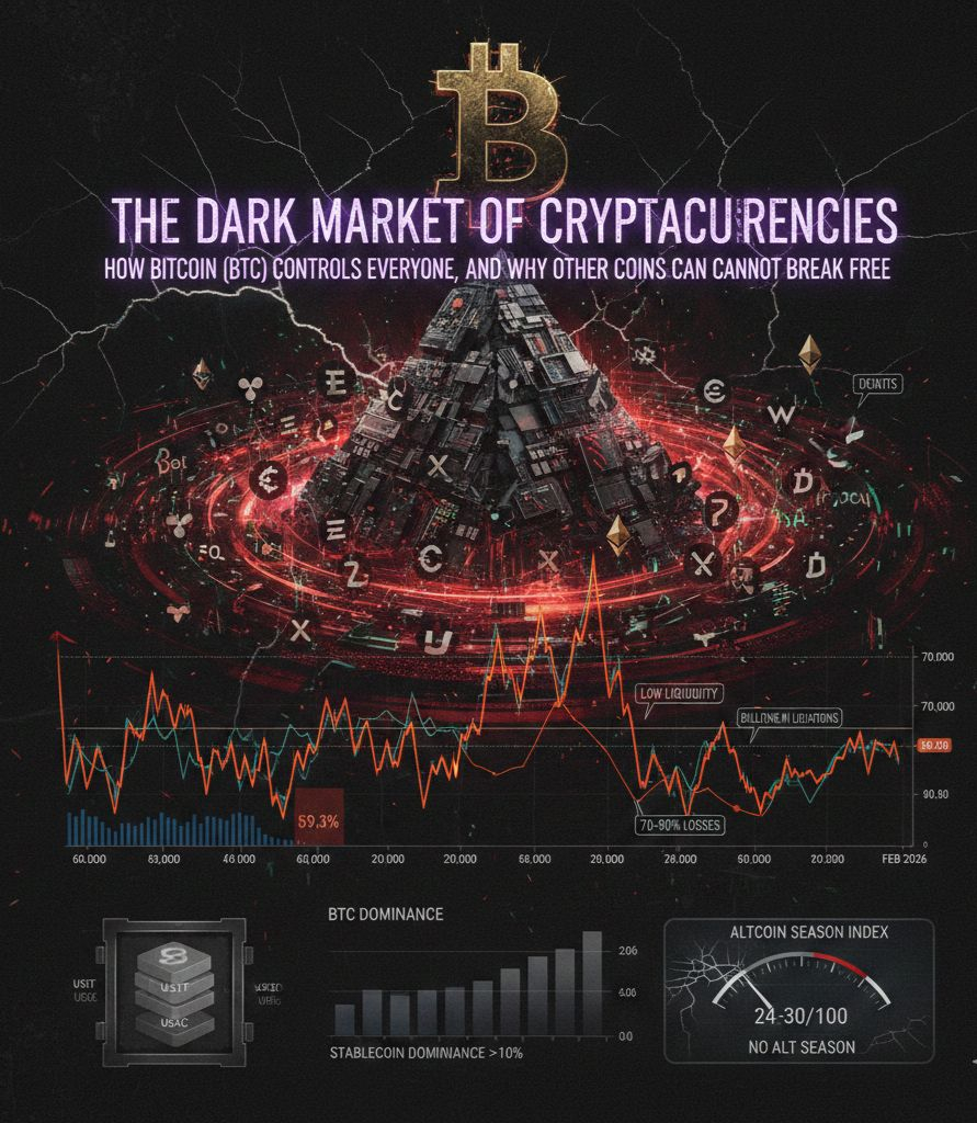 Bitcoin was never about “freedom”; it has always been the king that devours everyone when hunger strikes. Altcoins never liberated themselves—they were reused as tools to absorb losses and FOMO. The market is not a free economy; it is a closed system controlled by a tiny minority, with organized manipulation, fake liquidity, and fear that is reproduced cycle after cycle.