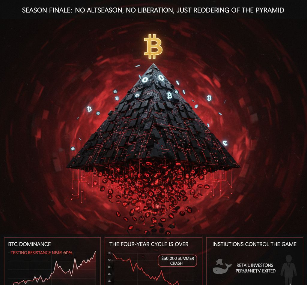 In this final episode, there is no explosive “altseason” like in 2017 or 2021. Instead, we are witnessing an “inverted altseason”: selective pumps in a handful of whale-favored altcoins, while the rest slowly die. Bitcoin dominance never drops below 55% meaningfully; it remains elevated (often testing resistance near 60%), proving that the market has matured… but matured into an even harsher pyramid structure.