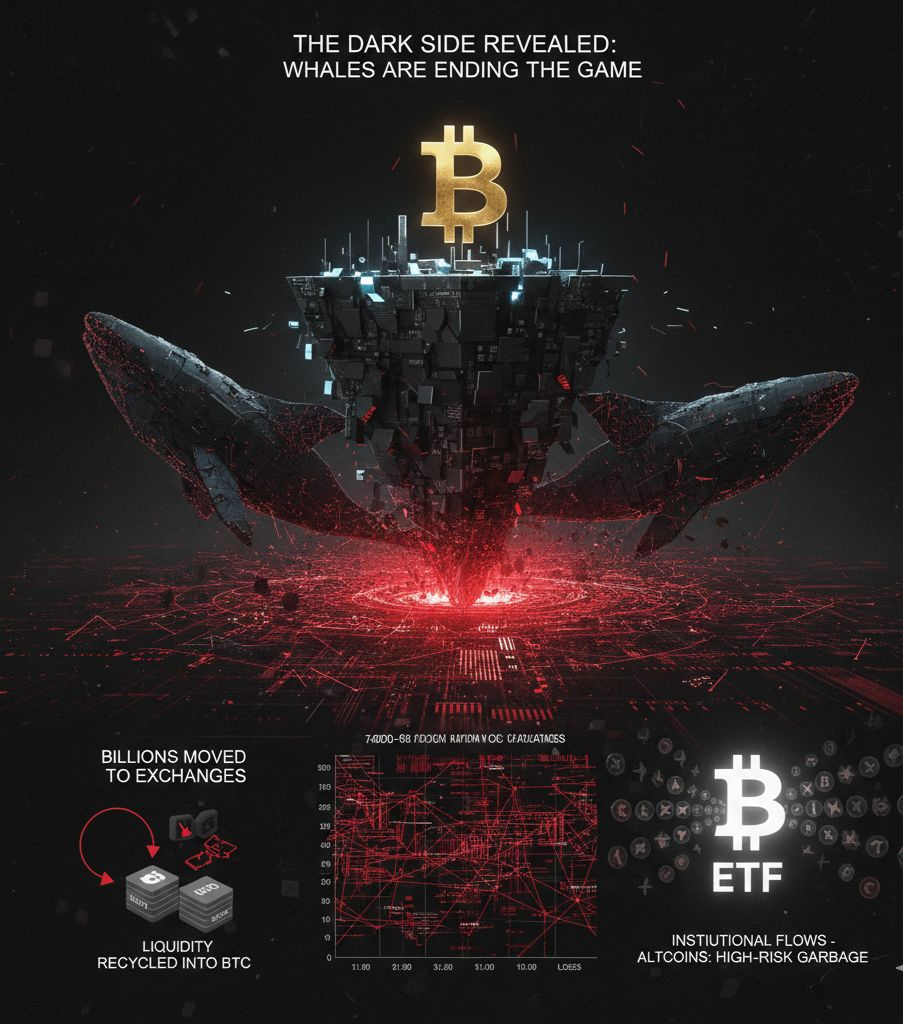 Regulation plays its lethal role: Bitcoin ETFs attract institutional flows, but they concentrate liquidity exclusively in BTC, making altcoins appear as prohibited or non-compliant speculation. Institutions do not merely want “digital gold”; they want BTC as a defensive asset, while altcoins are treated as high-risk garbage.