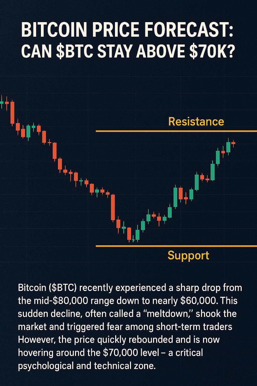 Bitcoin ($BTC) recently experienced a sharp drop from the mid-$80,000 range down to nearly $60,000. This sudden decline, often called a “meltdown,” shook the market and triggered fear among short-term traders. However, the price quickly rebounded and is now hovering around the $70,000 level, a critical psychological and technical zone.
