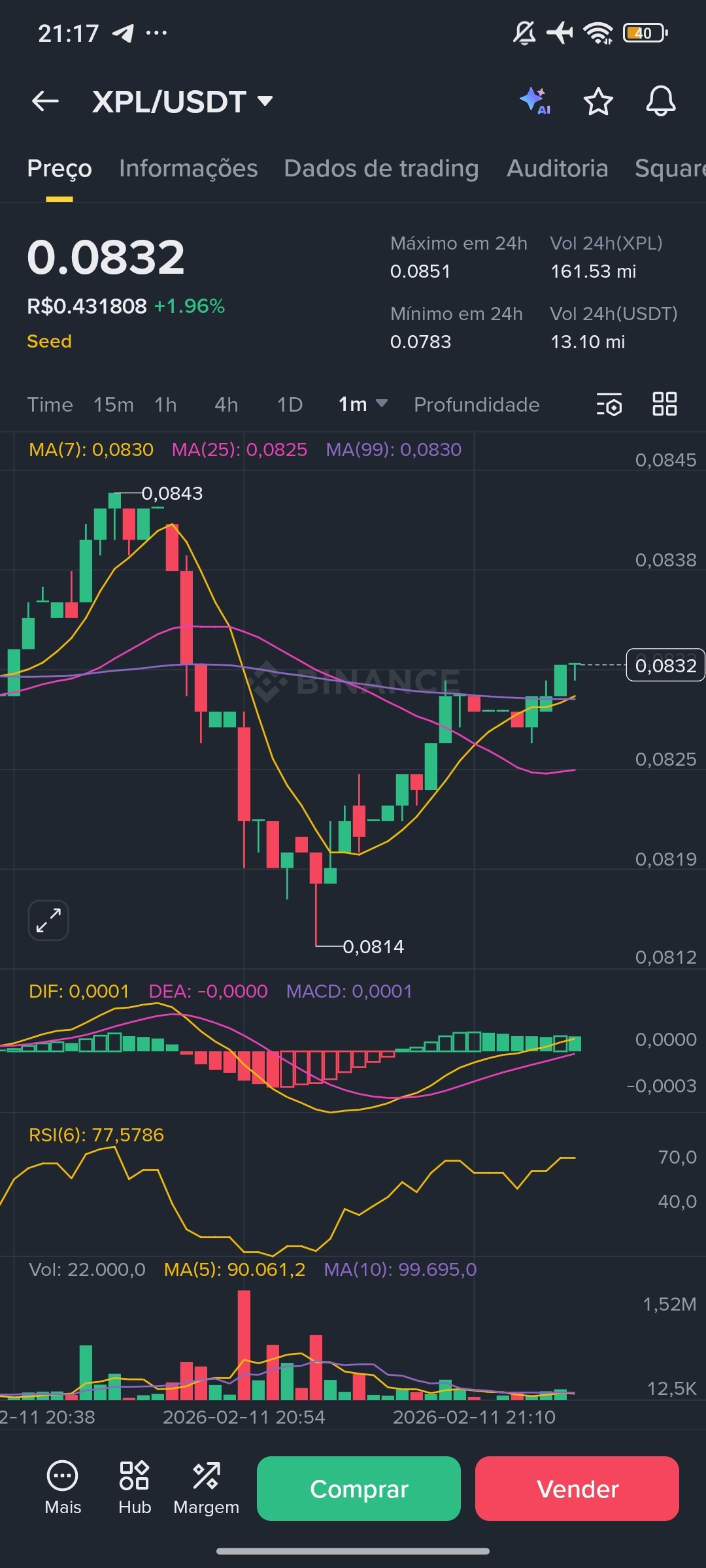 Falando em números, o $XPL mostrou movimento interessante nas últimas horas, operando em torno de 0.0832 USDT com alta de quase 2% no dia. O RSI em 77 indica força compradora, embora próximo de sobrecompra. O volume nas últimas 24h bateu mais de 161 milhões, mostrando que tem bastante gente prestando atenção no projeto.