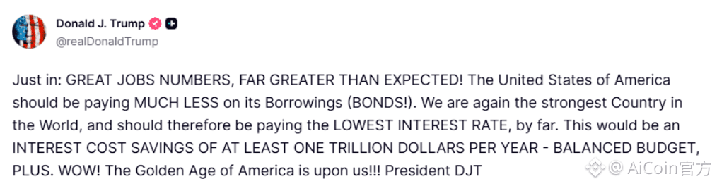 ● 特朗普在Truth Social上发的那段话,用词很值得玩味。他没提“通胀可控”,也没像往常那样骂鲍威尔,而是把降息包装成一种强国特权——“我们是世界第一,所以理应支付最低的利率”。