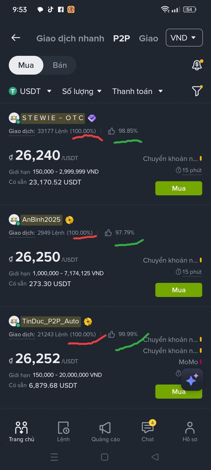 Một điều lưu ý rằng khi bạn sử dụng chức năng sẽ có một loạt danh sách những người mua và bán ,các bạn lưu ý nên chọn những người mua và bán có giá tối ưu(mua dc giá thấp,bán dc giá cao),tỷ lệ hoàn thành giao dịch cao( dấu đỏ trong hình,nên chọn người có 100%) kèm theo phản hồi từ những người đã từng mua và bán đó( dấu xanh lá,nên chọn nhưng người gần 100%)..Các bạn chú ý có những thời điểm các hàng đầu trong danh sách P2P họ quảng cáo và mua hay bán giá bất thường ( VD:giá USDT hiện tại là 25k nhưng họ mua chỉ 23k hay bán với giá 27k..v.v) thì Block nó ngay để khỏi hiện vào lần sau. Trừ khi bạn mua với số tiền cực lớn thì mới chi li tính toán còn ngoài ra nó chênh lệch vài VND cũng k sao miễn là chọn người mua bán uy tín..và thông số mình vừa kể trên thể hiện điều đó..Hạn chế mua với số tiền quá lớn trong một lần mà chia nhỏ ra.