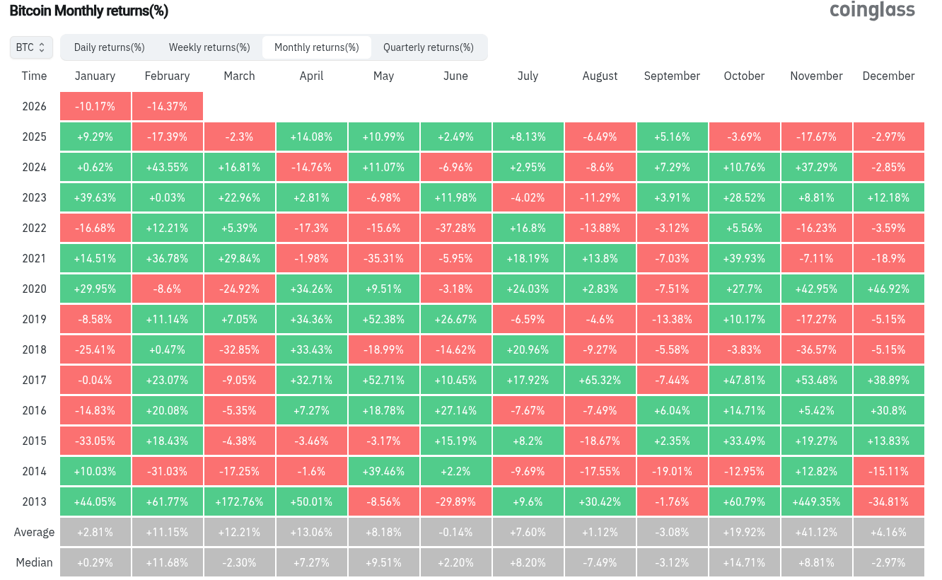 Data from monitoring resource CoinGlass shows that at -14.4%, Bitcoin’s February losses in 2026 are almost on par with last year’s performance. Still, since 2013, February has only ended in the red three times.
