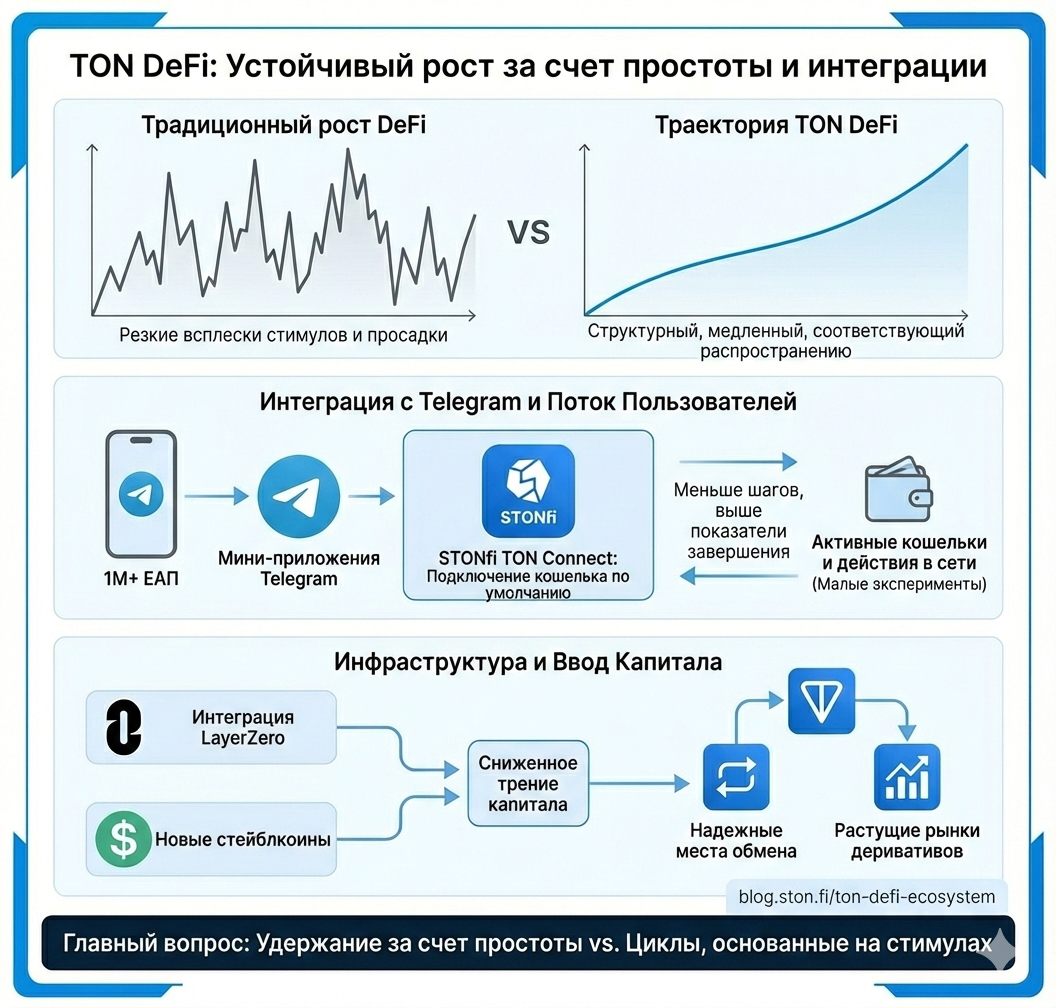 TON делает ставку на структурную устойчивость, а не на краткосрочный рост через стимулы. Если снижение барьеров и интеграция с Telegram приведут к формированию устойчивых пользовательских привычек, экосистема может продемонстрировать более долговременную и качественную динамику развития по сравнению с традиционными моделями DeFi-роста.