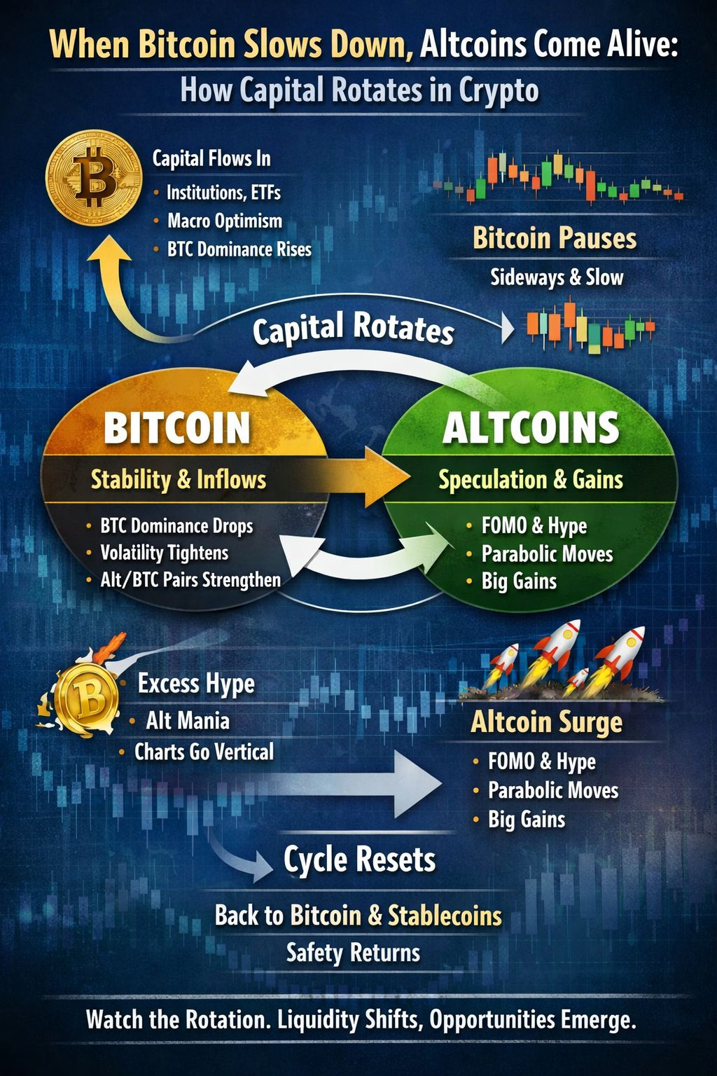 Importantly, Bitcoin does not need to turn bearish for altcoins to perform well. In healthy market expansions, BTC can move sideways while alts strongly outperform. The stable foundation allows risk appetite to expand.