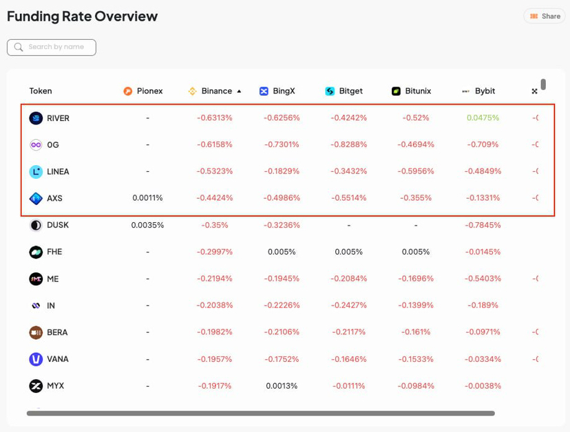 Tokens with elevated negative funding rates include $RIVER , LINEA, and 0G. Continued monitoring is advised.