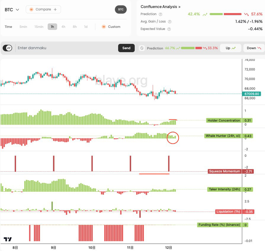 BTC long-concentration is declining, with whales leaning short, while bearish momentum remains steady. According to the Liquidation Map, price is approaching a major long liquidation cluster between 67k–65k.