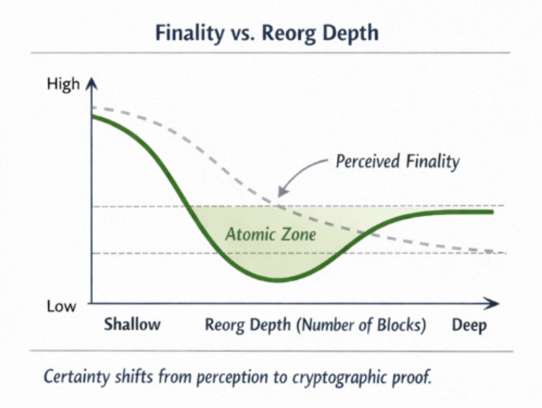 The diagram would demonstrate where economic finality can reasonably be claimed and where probabilistic exposure remains. It would visually separate perceived atomicity from cryptographic atomicity.