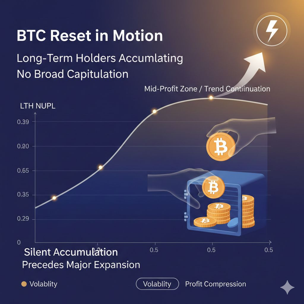 LTH NUPL has cooled to 0.39, a level historically associated with late-cycle pullbacks, not macro tops. This reflects profit compression, not structural weakness.