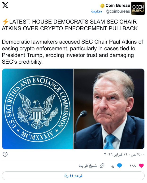 تتصاعد التوترات في واشنطن مع انتقاد الديمقراطيين في مجلس النواب علنًا لاتجاه إنفاذ هيئة الأوراق المالية والبورصات الأمريكية (SEC) في قطاع العملات المشفرة تحت رئاسة بول أتكينز. ويرى المشرّعون أن القرارات التنظيمية الأخيرة تُضعف الرقابة في وقت حاسم لأسواق الأصول الرقمية. ويعتقدون أن هذا التحول يهدد ثقة المستثمرين ويقوّض المساءلة.