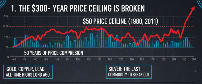 Unlike gold, copper, or even lead — all of which made new historical highs — silver remained the only major commodity capped beneath its prior peak for half a century.
