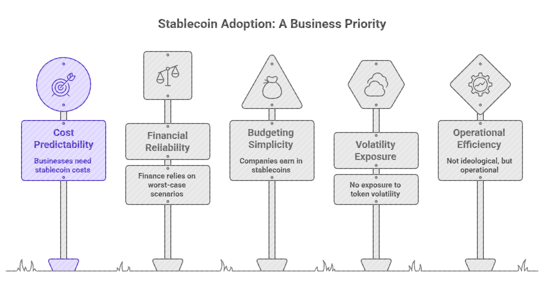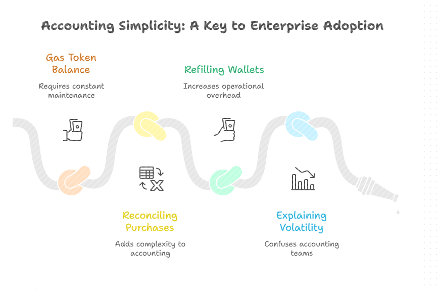 Every time a business must maintain a gas token balance, reconcile purchases, refill wallets, and explain token volatility to accounting teams, friction increases.