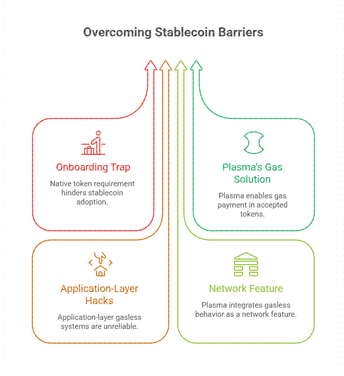 On most chains, if you do not own the native token, you cannot transact. That is the onboarding trap. You came to buy stablecoins, now you must buy something else.