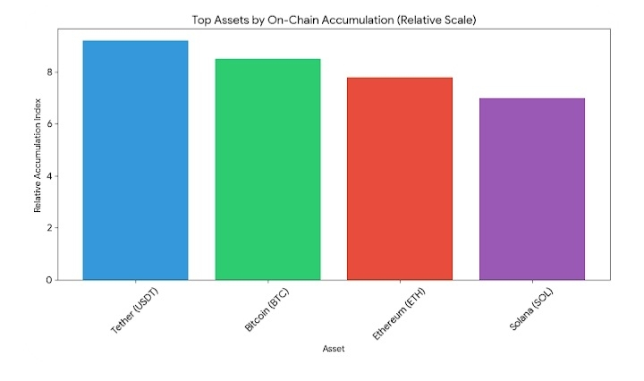 Here is the graph visualizing the relative accumulation of the top assets discussed based on current on-chain metrics.