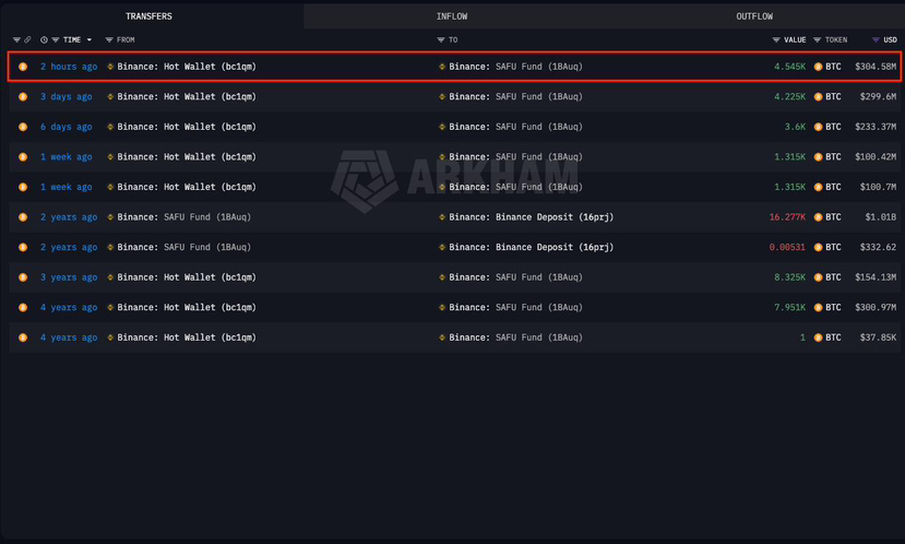 Binance vừa thực hiện giao dịch mua thêm 4.545 BTC (trị giá khoảng 304,58 triệu USD) cách đây vài giờ, đưa tổng holdings của quỹ SAFU lên 15.000 BTC, tương đương khoảng 1,005 tỷ USD (tại mức giá BTC hiện tại).