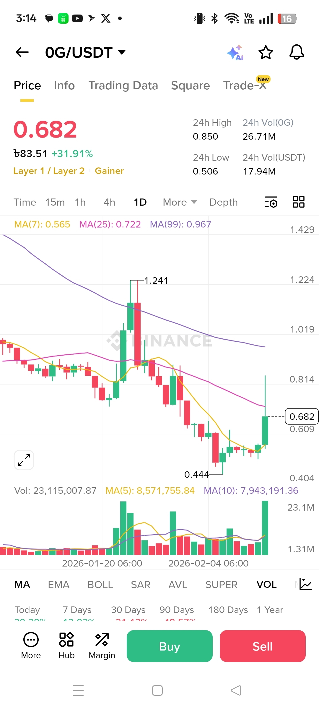 $OG on the 1D is setting up like a pretty standard bounce after a downtrend. That big green candle with heavy volume is the market’s way of saying buyers finally showed up, and with price sitting around 0.682 after bouncing off the ~0.444 swing low, the short-term tone has clearly improved. The MA(7) down at roughly 0.565 is a nice sign too, because it gives you a nearby “line in the sand” where price can pull back without instantly breaking the new bullish attempt.