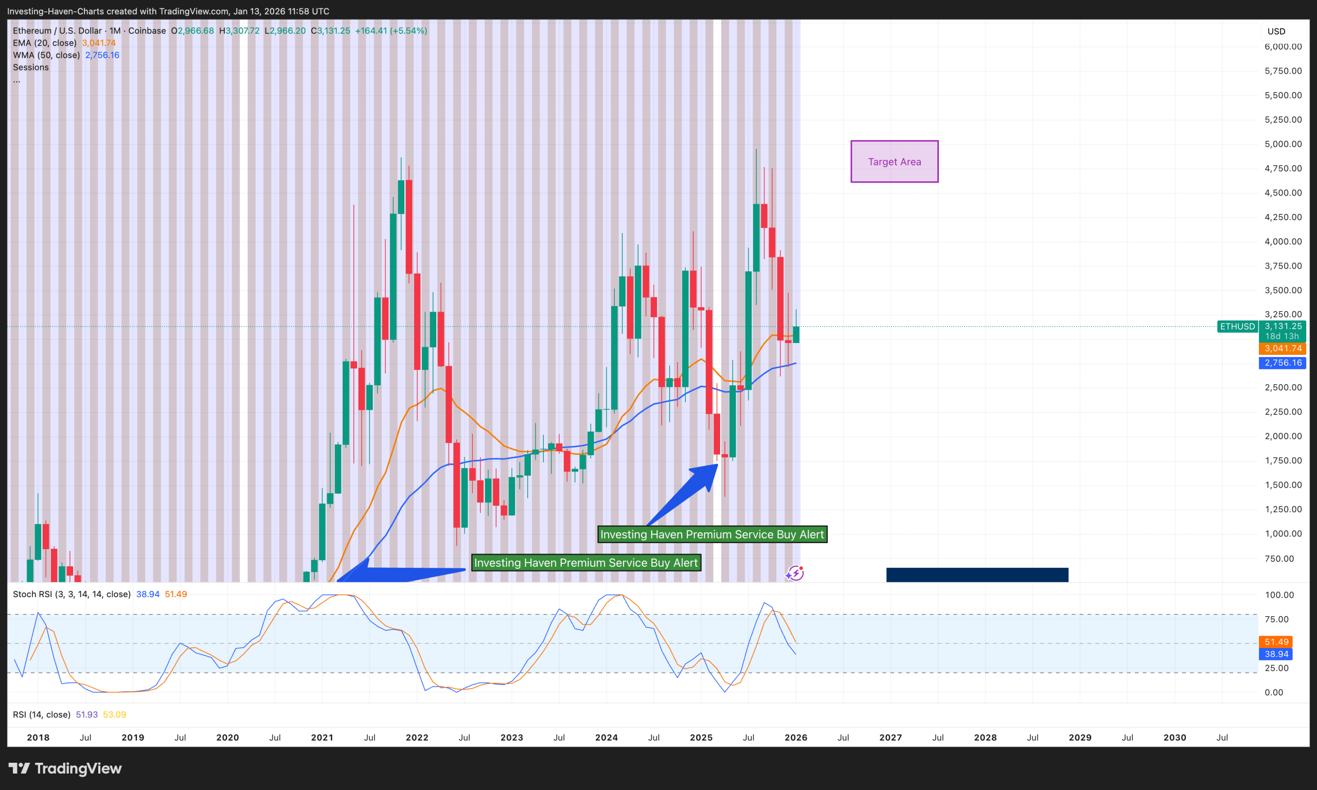 This long-term monthly chart from InvestingHaven shows the historical pattern clearly pointing to a "target area" well above current levels $5,000+ feels conservative in a full bull leg.