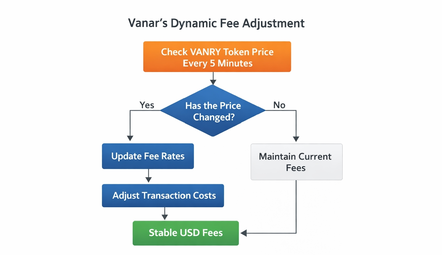The core shift is simple to say, but meaningful in practice. Instead of letting transaction fees float purely with token price and congestion dynamics, Vanar targets fees in dollar terms and then adapts the chain’s internal fee settings as the market price of the native gas token (VANRY) moves. The documentation is explicit about the mechanism: the protocol updates transaction fees every five minutes, checking price every 100th block, using a VANRY token price feed and then adjusting fees accordingly. That’s a very different mental model from “gas is an auction” or “gas is cheap because blocks are big.” It’s closer to a feedback loop that tries to keep user-facing costs stable even when the token isn’t.