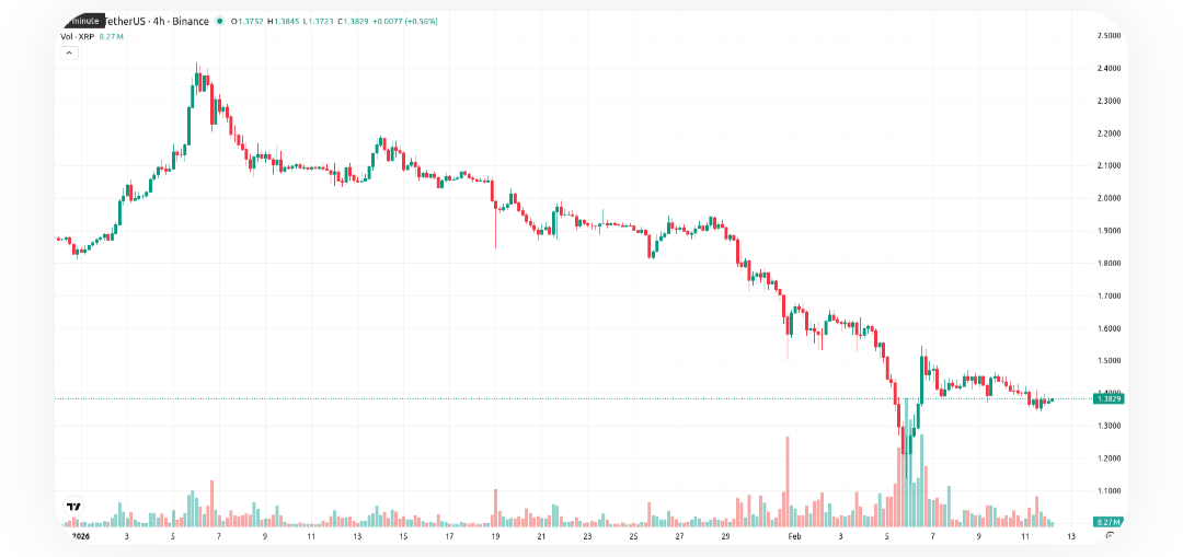 XRP-торгується на рівні $1,3802 після денного зростання на 1,14%, залишаючись значно нижче MA-20 ($1,6316), MA-50 ($1,8597) та MA-200 ($2,4199). Така ситуація підтверджує збереження коротко-, середньо- та довгострокового ведмежого імпульсу, попри дещо жорсткіший тон після відкриття торгів та помірну внутрішньоденну волатильність.