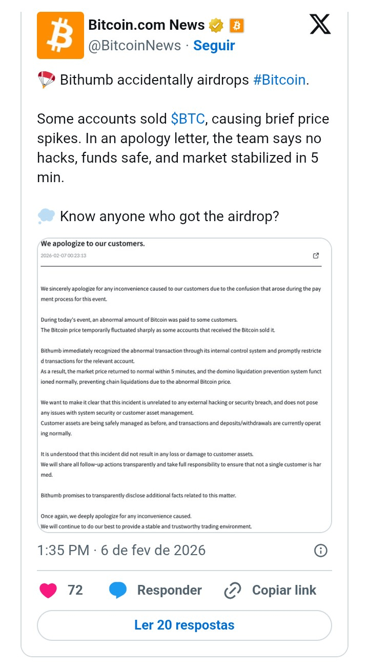 Lee ainda disse que isso mostrou “problema estrutural” nos sistemas internos das corretoras. O FSS já abriu investigação e o parlamento marcou uma audiência urgente pro dia 11 de fevereiro, chamando a turma da Bithumb e os reguladores pra dar satisfação.