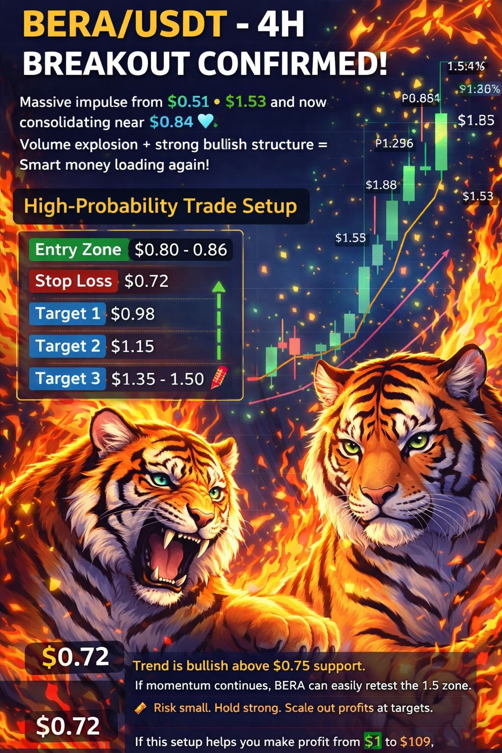 Massive impulse from 0.51 → 1.53 and now consolidating near 0.84 💎