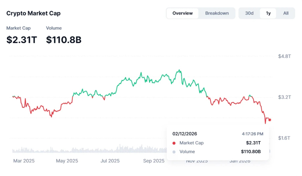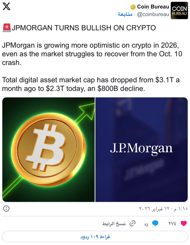 اتخذ بنك جي بي مورغان موقفًا أكثر إيجابية تجاه العملات المشفرة لعام 2026. وقال البنك إنه يتوقع تدفقات أقوى إلى الأصول الرقمية، حتى بعد التراجع الكبير في السوق. وخلال الشهر الماضي، انخفضت القيمة الإجمالية لسوق العملات المشفرة من 3.1 تريليون دولار إلى 2.3 تريليون دولار، ما أدى إلى محو نحو 800 مليار دولار من القيمة.