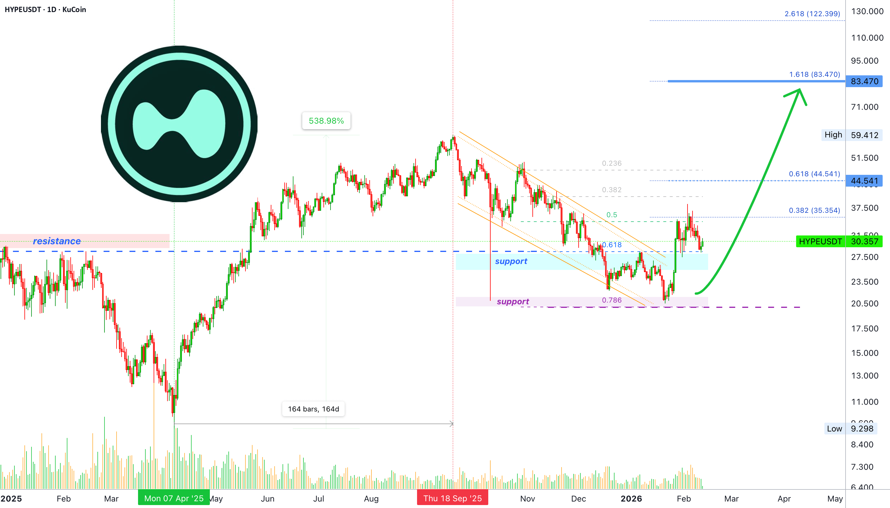 هايبرليكيد، HYPEUSDT، بدأت تتحرك بقوة في أواخر يناير 2026. بعد بضعة أيام فقط، حصلنا على التراجع الكلاسيكي. في 31 يناير بلغ سعره الأدنى $27. أمس أنتجت النقطة الثانية الأدنى عند $28 والسوق الآن يتحول بالكامل إلى الأخضر.