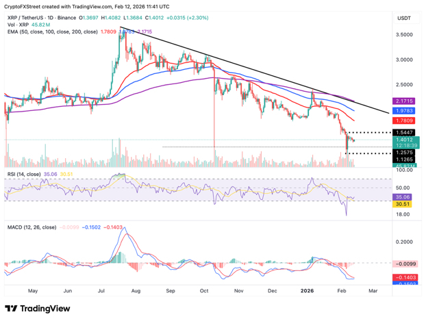 تتأرجح $XRP حول 1.40 دولار بعد ارتفاعها بنسبة 2% خلال اليوم. يبني انتعاش العملة المرسلة على مؤشرات إيجابية قليلاً، بدءًا من مؤشر القوة النسبية (RSI)، الذي تعافى من منطقة التشبع البيعي إلى 35 على الرسم البياني اليومي. قد يؤكد الانتعاش الممتد في RSI نحو خط المنتصف انتقالًا صعوديًا محتملاً.