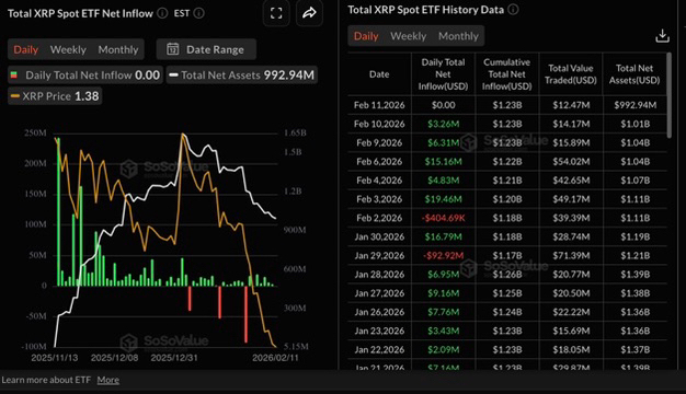 من ناحية أخرى، ظلت صناديق ETF الفورية لـ XRP هادئة، مع عدم وجود تدفقات يوم الخميس، مما ترك التدفقات التراكمية عند 1.23 مليار دولار والأصول الصافية تحت الإدارة بحوالي 993 مليون دولار. قبل ذلك، كانت صناديق ETF قد حافظت على سلسلة من التدفقات لمدة خمسة أيام.
