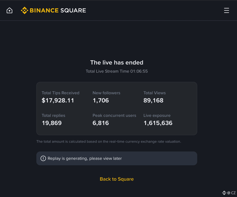 CZ just shared the results of his live session and honestly the numbers are crazy. The live went for about 1 hour and 6 minutes, and look at what happened during that short time. Over 89,000 total views, more than 1.6 million live exposure, 6,800+ peak people watching at the same time. This is not small thing.