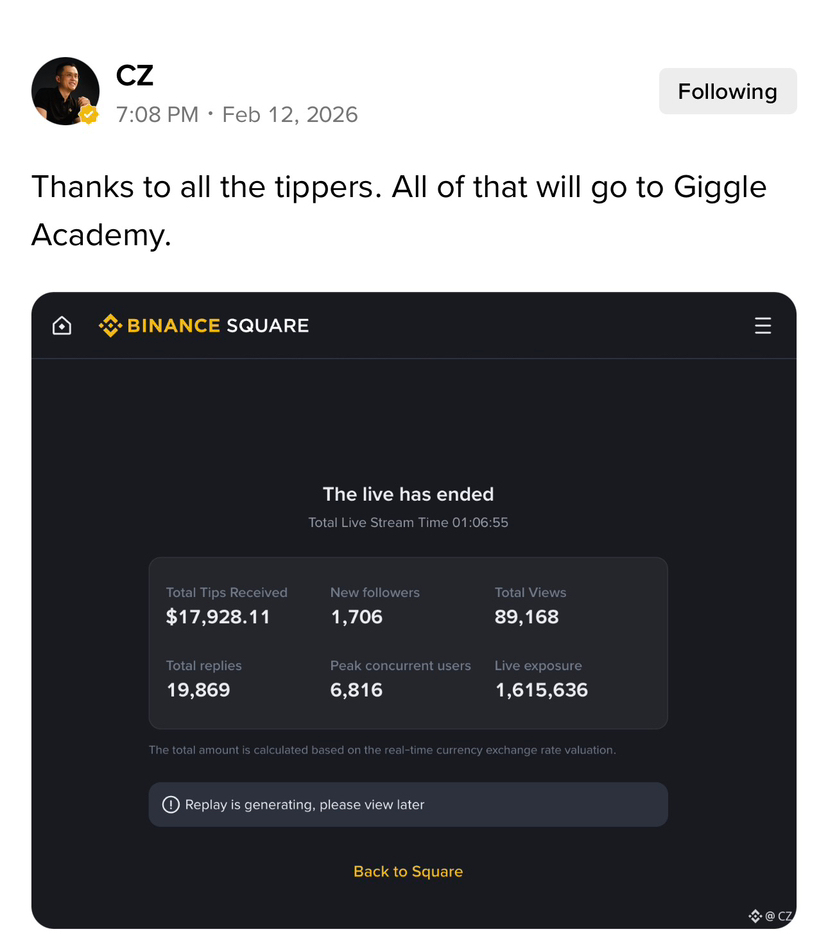 When CZ goes live, itâs not just entertainment. Sometimes there is big information, sometimes market direction hints, sometimes ecosystem updates. And now even tipping system that support good cause like Giggle Academy.