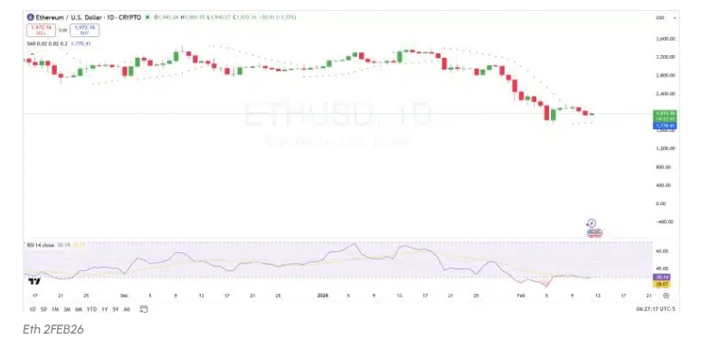 The Parabolic SAR dots have also flipped below the price around $1,770, signaling a tentative short-term bullish shift. However, for a meaningful trend reversal, traders would need to see the RSI decisively push above 40–50 while price clears the $2,000 resistance zone. Until then, Ethereum remains in a fragile recovery phase rather than a confirmed breakout environment.