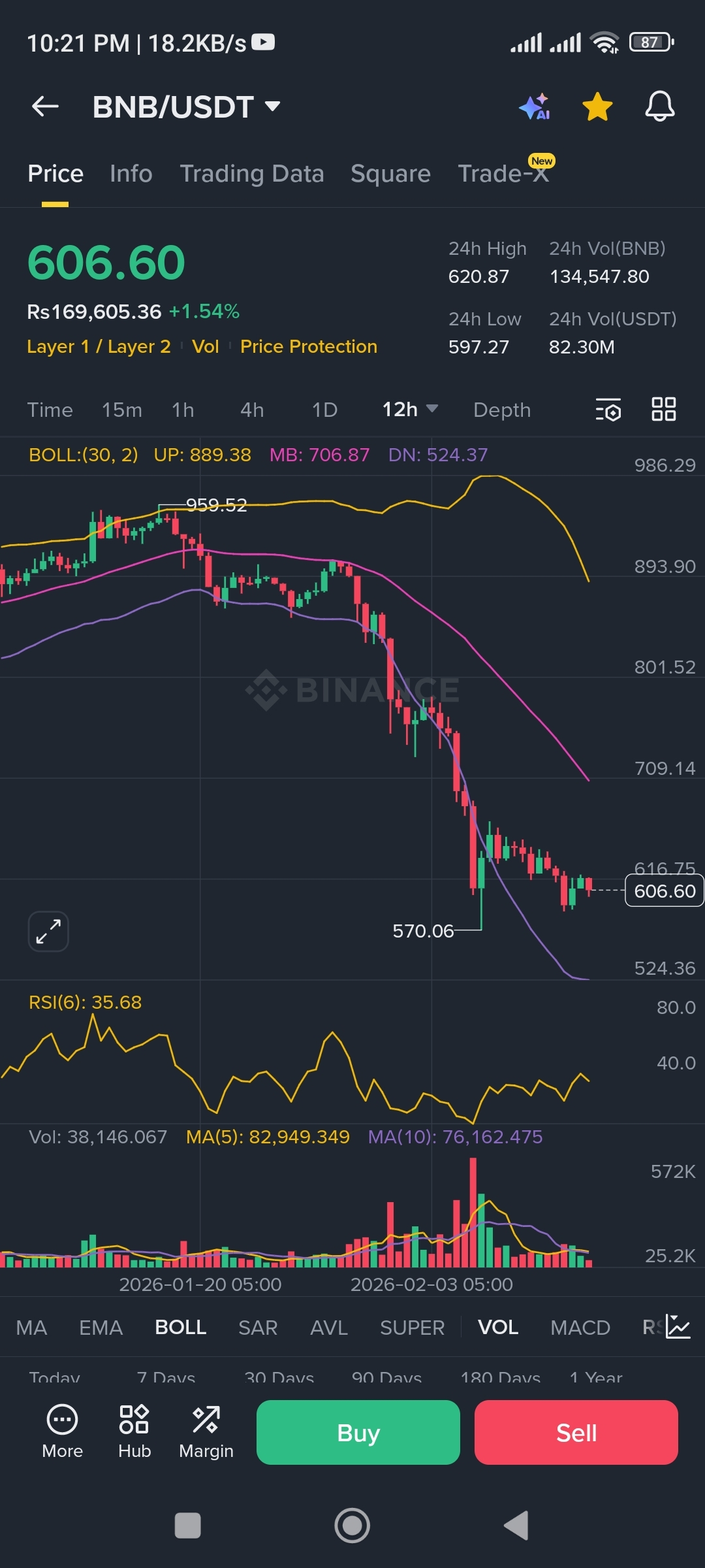 The Price Envelope (Bollinger Bands): These bands act like a channel the price tends to stay inside. BNB at $606 has dropped well below the midpoint ($706) and bounced right near the bottom edge ($524). When price touches that lower wall and holds, it's often the market catching its breath before heading back toward the middle. That midpoint at ~$706 is the natural target to watch.