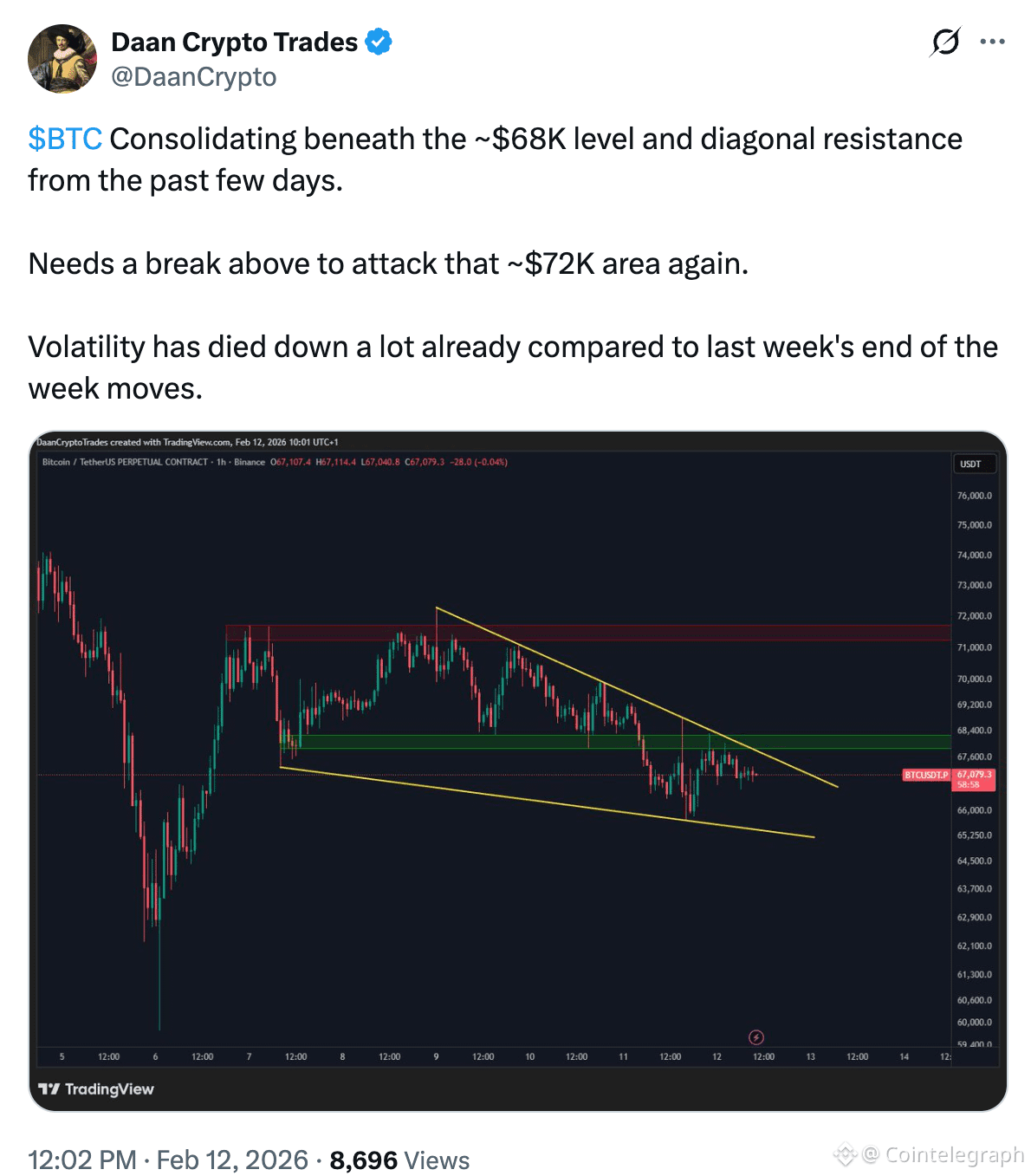 It is now consolidating within the recently established support below $65,000 and the resistance at $68,000, which analyst Daan Crypto Trades said bulls must “break above to attack $72,000 again.”