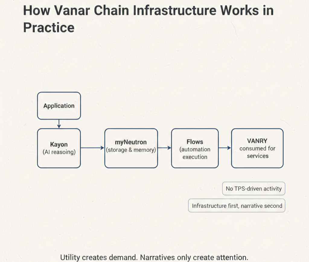 VANRY reflects this philosophy in an understated way. The token isn't positioned as exposure to infrastructure that might someday be important. It underpins usage of systems that exist now. When applications store data through Neutron, query reasoning through Kayon, execute automation through Flows, they consume VANRY for actual infrastructure services rather than speculating on future potential.