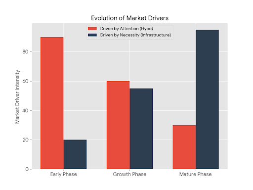 This is why attention cycles often lag behind infrastructure cycles. By the time infrastructure becomes visible, it has already become essential.