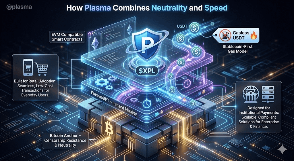 Plasma is a Layer 1 blockchain purpose built for stablecoin settlement. While many networks support stablecoins as applications within broader ecosystems, Plasma designs the base layer specifically around their needs. One of its most defining characteristics is Bitcoin anchored security, combined with Plasma BFT for sub second finality and full EVM compatibility through Reth. Its native token, $XPL, supports the network’s operational and economic structure. To understand why this matters, we need to examine the concept of neutrality in financial infrastructure.