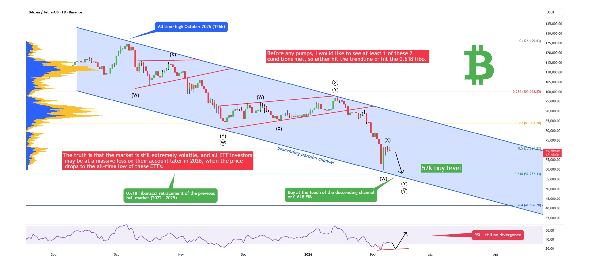 On the daily chart, $BITCOIN is trading inside a descending parallel channel.