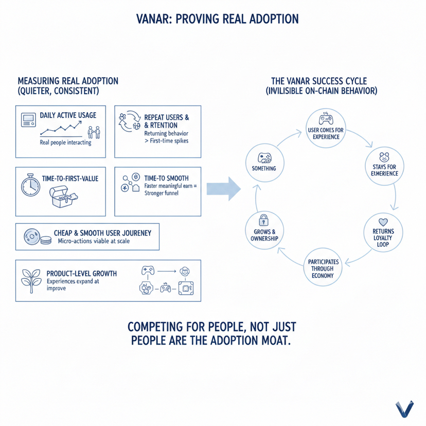 If I wanted to prove that Vanar is actually achieving adoption through this funnel, I wouldn’t focus on the loudest market metrics because those can move on hype, and I wouldn’t let short-term attention convince me, because real adoption looks quieter but more consistent, so I would focus on daily active usage that reflects real people interacting, I would track repeat users and retention because returning behavior matters more than first-time spikes, I would measure time-to-first-value because the faster a new user earns something meaningful, the stronger the funnel, I would watch how cheap and smooth the average user journey stays as activity grows because micro-actions must remain viable at scale, and I would track product-level growth because the strongest adoption signal is when the experiences themselves keep expanding and improving over time.
