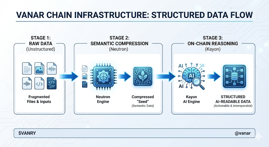 A core component of this design is semantic data compression. Rather than storing unstructured files that require off-chain processing, Vanar Chain introduces a method of transforming information into structured units optimized for interpretation. This allows complex datasets such as documents, media, or compliance records to exist on-chain in a format that can be logically analyzed. The benefit is reduced dependency on external AI services and improved trust minimization within decentralized environments.