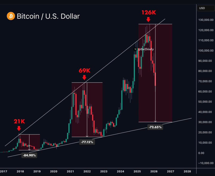 History shows a consistent pattern: major tops are followed by drawdowns of similar magnitude across cycles, not because Bitcoin loses relevance, but because leverage, excess optimism, and mispositioned capital must be reset before a new cycle can emerge.