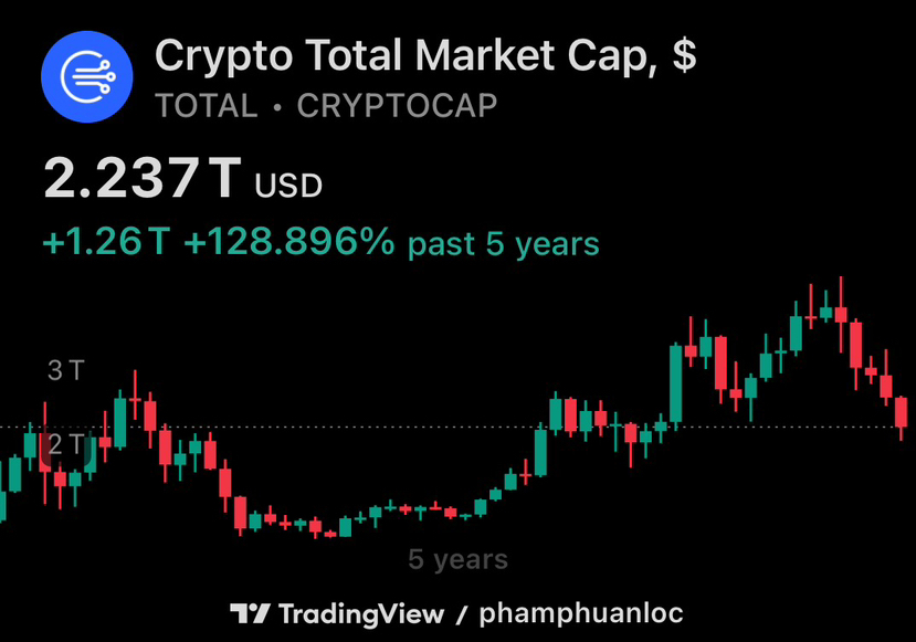 The same logic applies to the broader crypto market, where total capitalization continues to expand over time despite repeated cycles of expansion and contraction, showing that capital does not disappear in crises but is reallocated through periods of stress.