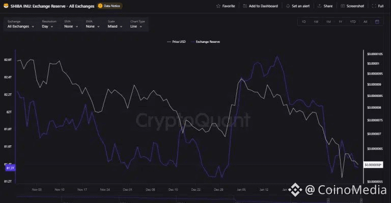 Shiba Inu (SHIB) is currently holding a significant weekly support range between $0.0000060 and $0.0000056, a level it has respected for more than four years without a confirmed breakdown. Recent data shows exchange reserves declined by 316 billion SHIB over five days, bringing totals to 81.3 trillion, which may suggest some degree of accumulation rather than aggressive selling.